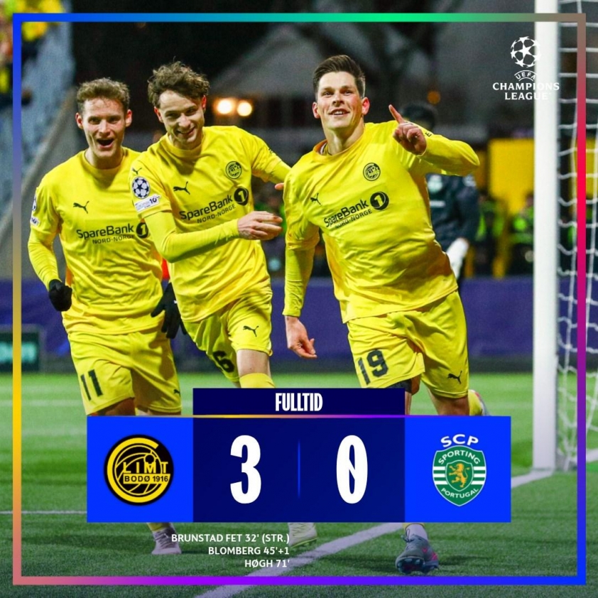 (Football result) - Bodø/Glimt achieved its fifth straight win in the UEFA Champions League main stage by defeating Sporting CP 3-0 in the first leg of the round of 16 held at Aspmyra Stadion.